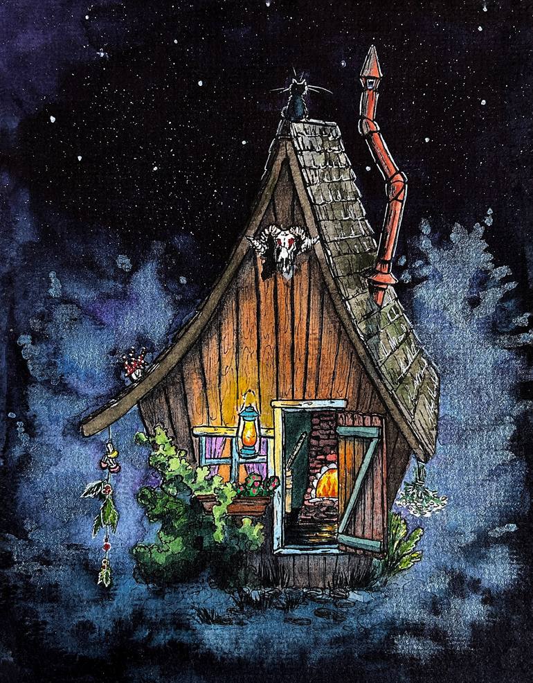 A mysterious night, with silver shadows dancing around the edges of reality and magic. The witch’s hut stands quiet under the stars, but the door is slightly ajar—as if it’s waiting for someone brave enough to step inside. I painted this scene because I’ve always loved dark fairy tales. Since childh...
