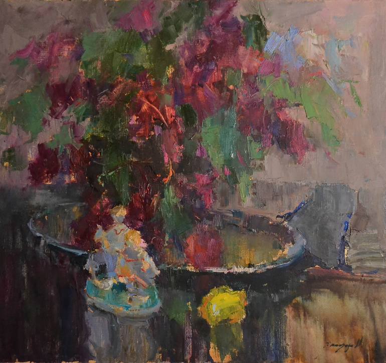 A vibrant display of flowers with bold brushstrokes captures a lively and colorful arrangement. The rich combination of reds, greens, and purples contrasts with a muted background, bringing focus to the centerpiece. Alexander Shandor is an Ukrainian artist, who was born in 1981. He is presently res...
