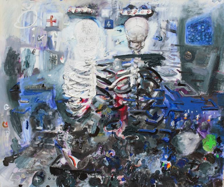 Myths in/about modernity Georg Redžek’s paintings are characterized by allegory, reference to the works of Bosch, Brueghel and Dürer, as well as by self-awareness about the problems of the new-millennial digital age. Seemingly incompatible, these three characteristics meet in Redžek’s works thanks to his combination of classical motifs and representative signs of the modern, contemporary age. In the latest series of works created during 2020 and 2021, the classical motifs are a labyrinth, a white rabbit (as a symbol of resurrection, reincarnation and revitalization), Last Supper and pigs in front of which “pearls had been thrown”. Redžek sets these classical motifs in compositions with representatives of modern and contemporary times, such as displays, bar codes, cables, the Coca-Cola logo, in order to re-examine and display the time in which we live. The labyrinth is an allegorical motif that has fascinated people since the ancient days, becoming a symbol of human perseverance, resourcefulness, skills, but also of complete loss and inability to get out of a given situation. It is therefore associated with feelings of anxiety, alienation, separation from others, fear of complete helplessness, but it also becomes a symbol of contemporaneity for which it is not known in which direction it develops (degrades) and how it can end. To these features of the labyrinth, Redžek adds new values, showing that the labyrinth is more than an adequate symbol to represent the global events that have taken place over the past two years. In one painting, the labyrinth is an allegory of a completely desolate city, seemingly mythical or dystopian, but in fact extremely realistic, because the cities were completely empty during recent lockdowns and restrictive measures. Without a single person, the labyrinth loses its meaning – without a man lost in it, the labyrinth in itself represents nothing, which shows that a city without people on the streets is no longer a city. In the second painting, the motif of labyrinth becomes a set of multiplied walls as a still applied system of separation and segregation. By reducing labyrinth to walls, Redžek introduces a novelty in his work in a sense that he does not create reminisce about Bosch, Bruegel or Dürer, but he quotes works of the contemporary artist Banksy, namely his art of resistance, ie the art of graffiti and murals on public walls.