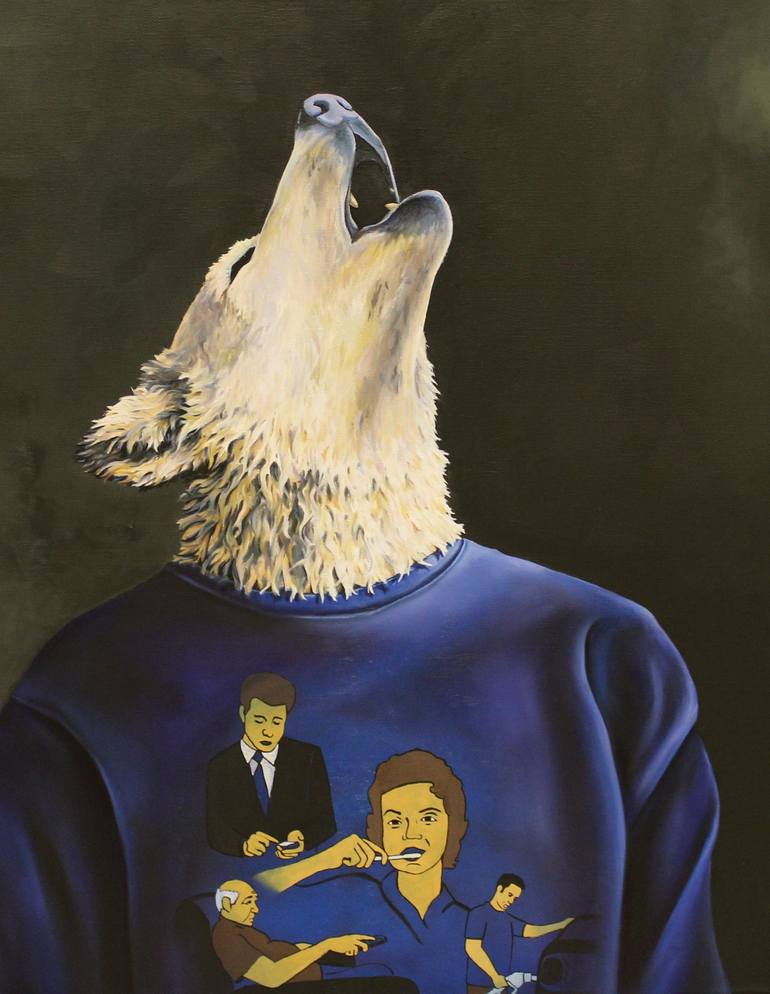 The lion on a cliff top or wolf howling in a majestic profile are all thing that seem normal when not printed on a shirt or plastered to the back of a truck. If a wolf could wear a shirt with humans doing mundane everyday things I think it would look something like this.