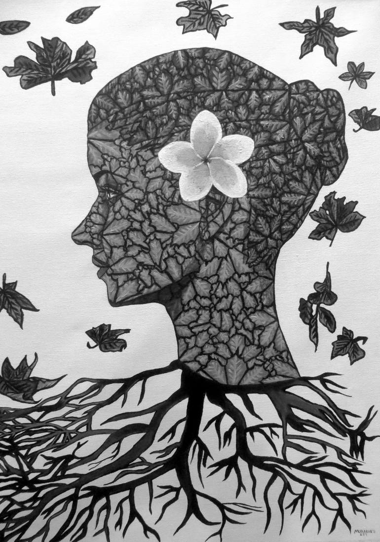 Artwork title: Woman Leaf Art Portrait Painting with Roots greyscale "Nurturing Life: Embracing Greenery for Our Survival" Artwork Dimension: 30 by 36 Inches Artwork Medium: Acrylic on Canvas Medium Total Time: Approx. 30+ Hours As an artist, my primary focus is to raise awareness about the pressi...