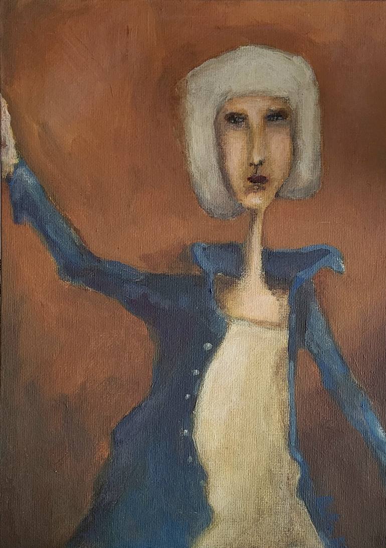 This painting is a portrait of a woman with a distinctive style. Short, white hair and is wearing a blue coat over a light-colored dress. Her elongated neck and torso create a somewhat surreal or elongated appearance. The background is a warm, earthy brown, which contrasts with the cool tones of her...