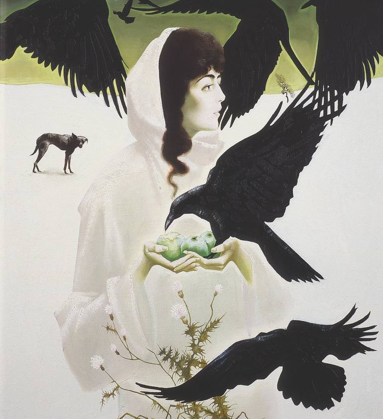 The image of the dark-haired stranger in a white raincoat arises again in a painting of the artist, but she loses human reality and becomes a cold and distant symbol. Not in vain the winter silence comes to replace the warm palette of autumn, against which the black silhouettes of huge ravens look a...
