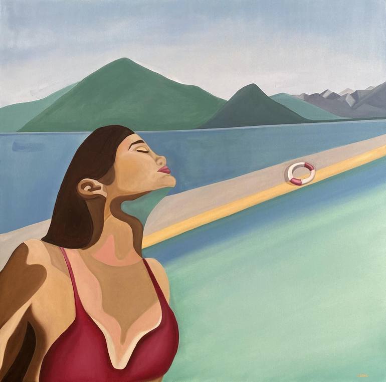 A woman in a red swimsuit on the lake Como, Italy. Painting is done with il paints on fiber canvas.