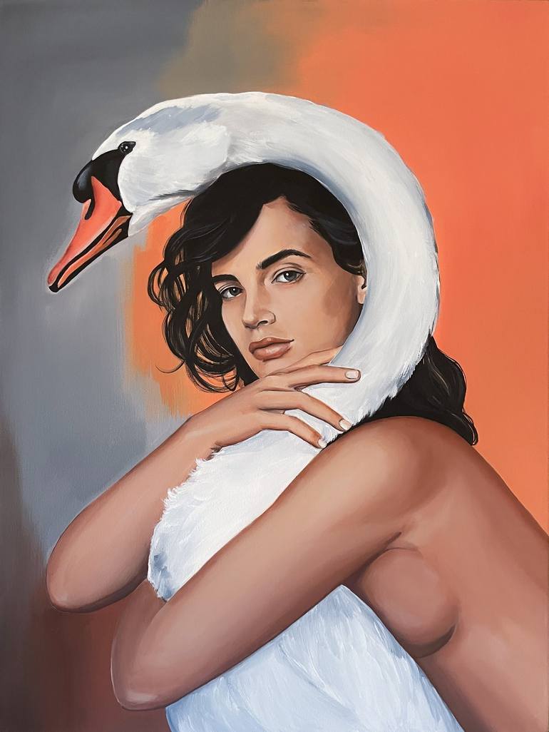 Contemporary portrait of a woman with a white swan. Expressive brown eyes, tanned skin, dark hair in contrast with the snow-white bird. The girl’s soft and calm gaze conveys a state of calm and coquetry. The swan in art is a symbol of beauty, nobility and love. The painting is made with professional...