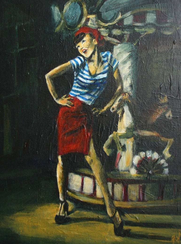 I have made this painting for the collection 'Between Art & Kitsch'. It is a fun painting with a bit of nostalgia. It reminds of the 1920s and looks a bit like a pin-up. In the background is a bit of the carnival showing. The body of the pretty girl takes most of the light. It makes the blue and red...