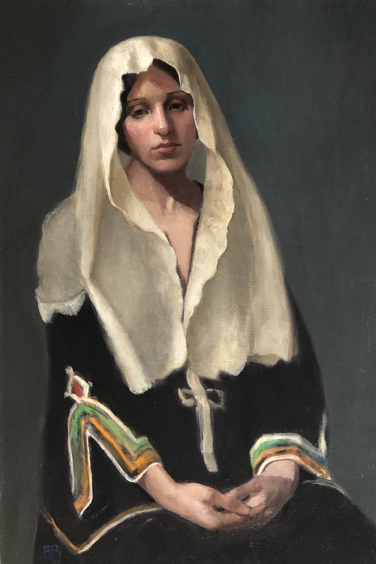 Painted from life, the sitter wears an expression as slightly melancholic as it is devotional which actually befits the nature of the garment she is wearing.