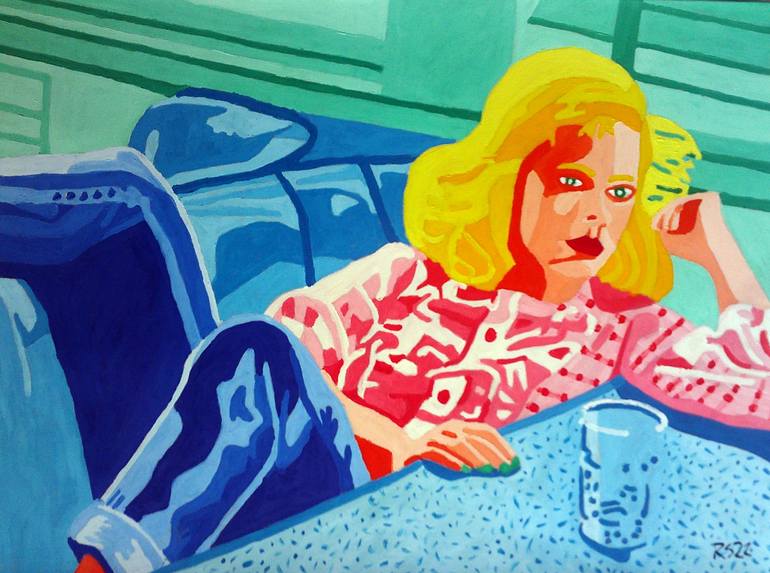 Woman sitting in diner in a figurative expressionist style