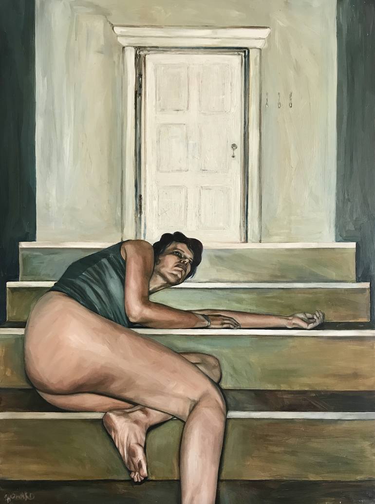 This is a stunning print of the original painting in oils entitled, Woman on steps.
