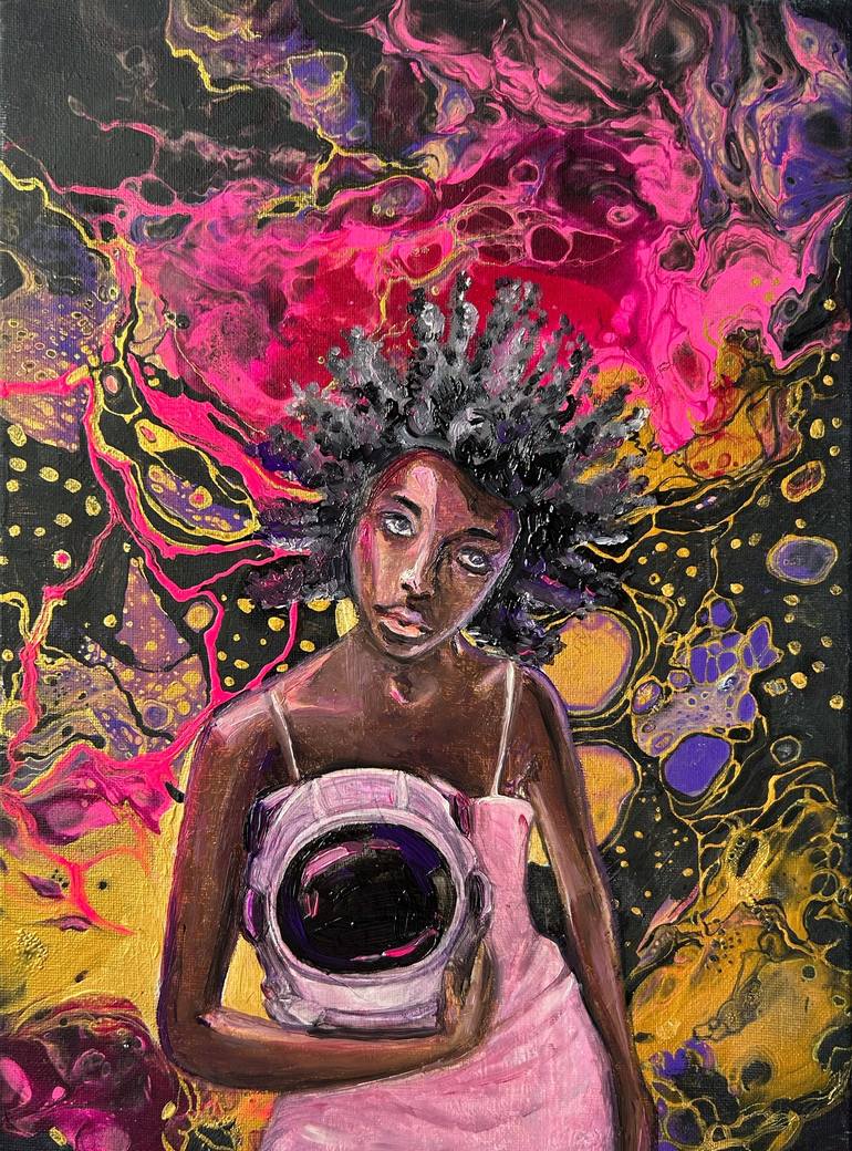 Afrofuturistic painting. An oil painting of a black woman in space on an abstract acrylic background in vibrant pink, black, and gold on a 30x40 cm stretched canvas that is ready to hang. Acrylic varnish is applied to the artwork to preserve the colors and improve their intensity. Please be aware th...