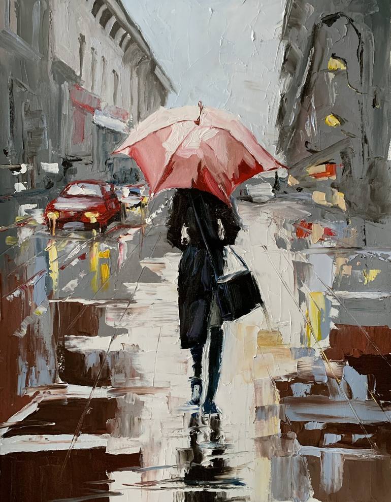 Woman with umbrella in a rainy city. Print