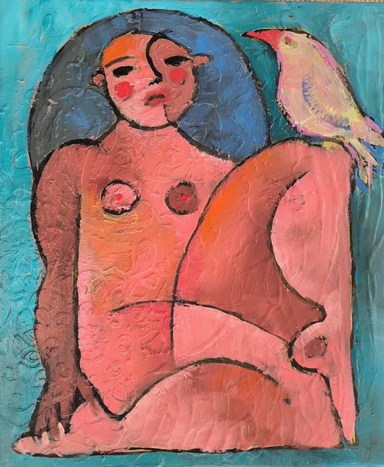A woman and a bird. The bird is a symbol of good news. The woman waits and is sad. But the good news will come.