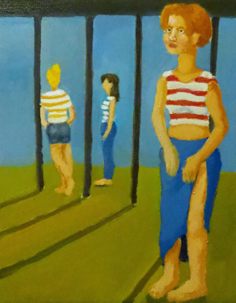 A trio of women, one taking center stage, slightly engaging the viewer while two other figures sit ambiguously in the background.