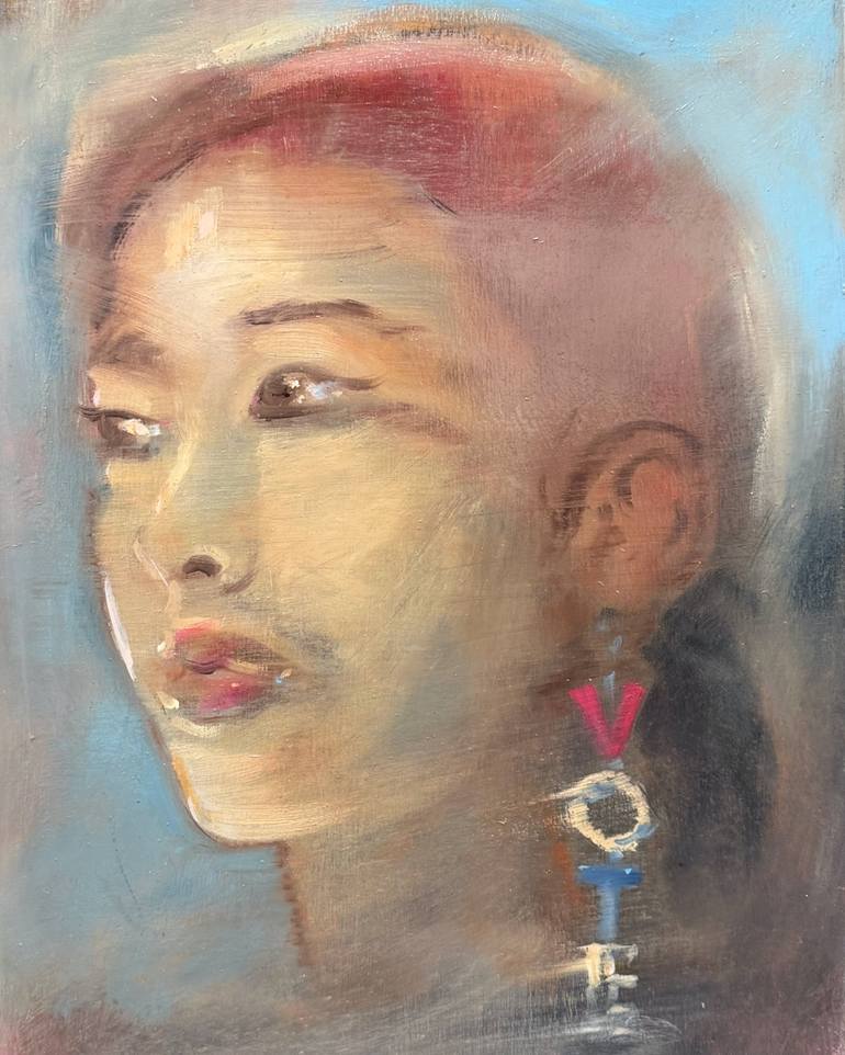 Inspired by Vermeer's iconic painting "Girl With a Pearl Earring", my oil on wood painting "VOTE" is a recognition of the power of democracy.