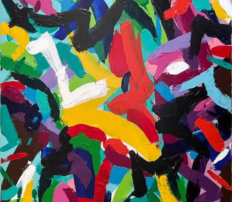 "Wonder" is another explosive-like ribbons type of shapes, a simple thing. fun for fun. I was just experimenting with different colors and shapes and I started with a turquoise background and a pink background and split it in half and finished it you could hardly see it but those are all acrylics. T...