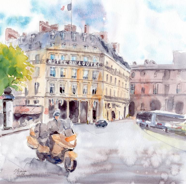 This is a light watercolor from the Paris Impressions series. Every view of Paris wants to be drawn and captured in art! I love the combination of recognizable objects and abstract watercolor spots and splashes in the painting. The artwork has been done with high light color watercolors on high-qua...