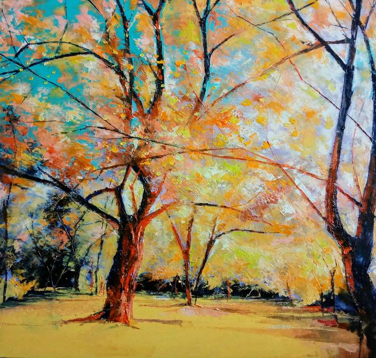 Inadvertently discover sunlight, wind, trees, leaves, and the most beautiful time. Draw until dark. Oil painting on paper, 36x36cm. Signed low left corner.