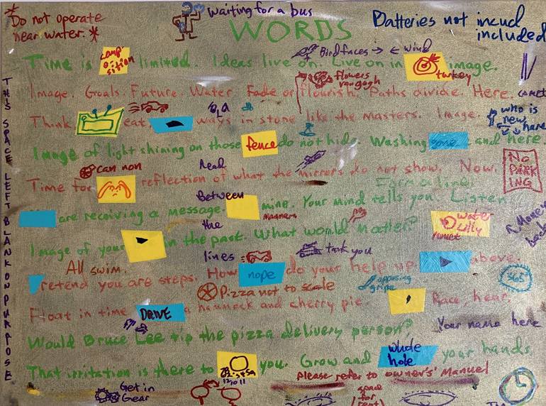 Gold paint and writing reflect differently. A work on canvas with acrylic, permanent markers and new signage material. Covered in a thick varnish for artists to protect from dirt and UV. Ready to hang with letter of authenticity included. Signed and dated on the back. Thank you for looking.