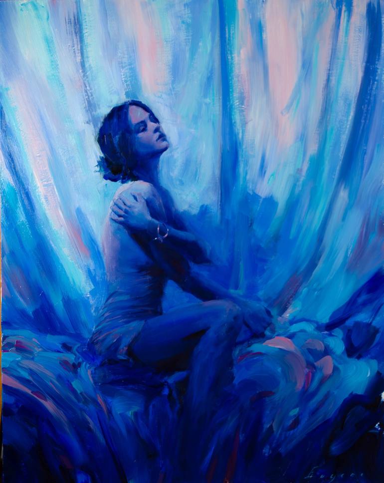 This painting depicts a figure bathed in a wash of cool, flowing blues, evoking a sense of tranquillity and introspection. The sitter, seated and slightly turned, seems to merge with the ethereal background, which swirls around her like cascading waves or delicate drapery. The soft, diffused light c...