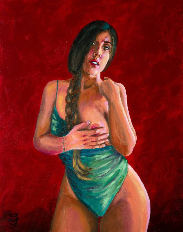 In this portrait of Leina (creator of adult content) I was looking for the contrast between her innocent expression and the modest gesture of her hand trying to cover her breast with very intense red background that gives the scene a somewhat demonic warmth. En este retrato de Leina (creadora de c...