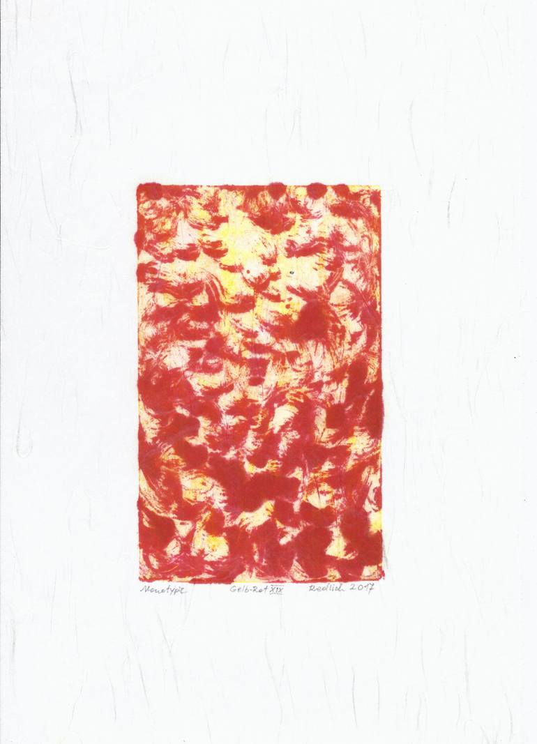 Impetuously painted with oil on engraved zinc plate and handprinted on Japanese paper. Besides the white colour gammut yellow and red are my favourite colours.