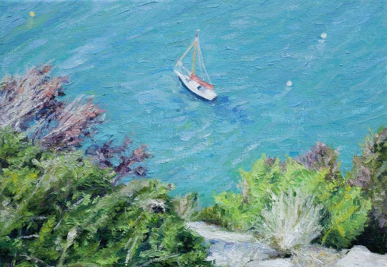 The Coastal Path of North Wales is outstandingly beautiful, here climbing out of the bay at Llanbedrog you climb up though the cool wooded slopes to get to the cliff top, this view looks down and back towards the beach where an irresitable view of the moored boat was too good to not paint; especiall...