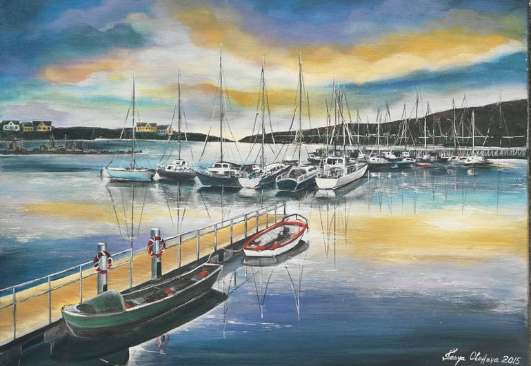 I drew a bay some years ago. The yachts docked after a long day. You can see small houses in the distance. The ships are reflected in the sea mirror. The picture painted with acrylic on canvas, varnished. I am attaching a certificate of authenticity and authorship For me, there is nothing more exc...
