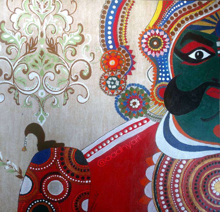 This painting is for sale Yakshagana is a theatrical form of presenting Mythological and historical stories. A Yakshagana performance includes music, dance and dialogues The word Yakshgana means the songs of the Demi-Gods (yaksh ‘meaning Demi-God, and ‘gana’ meaning song). The performers wear inter...
