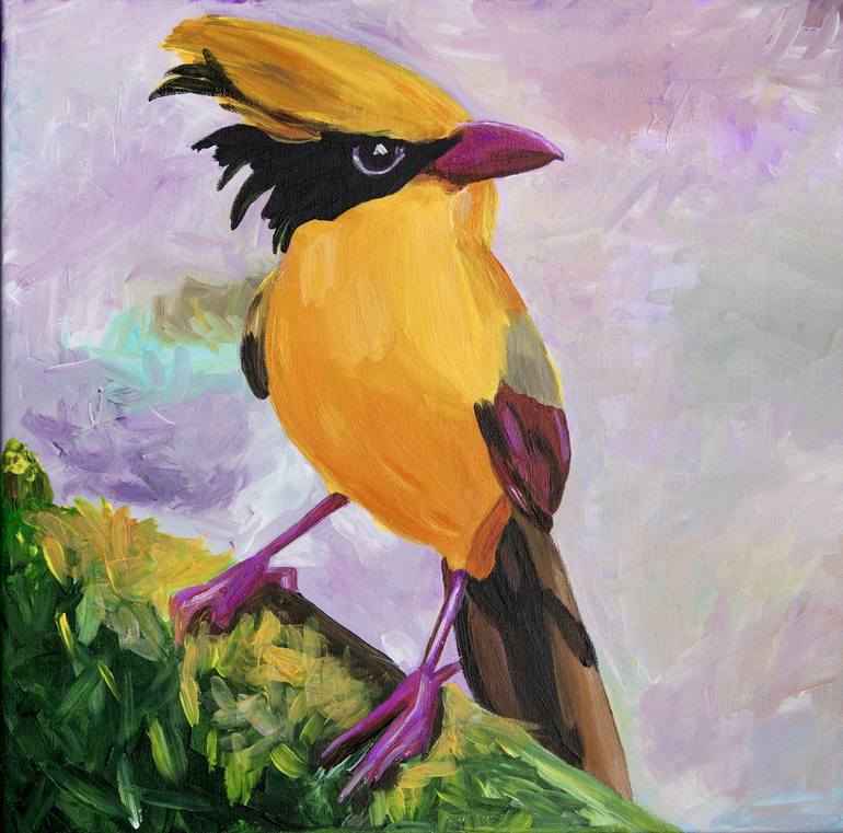 A bright, exotic bird is depicted on a 40×40 cm square canvas, painted with acrylics. Its plumage captivates the viewer with vivid shades of yellow, black, and burgundy. The most striking feature is the crested head with a contrasting mask around the eye — this detail gives the bird a charismatic an...