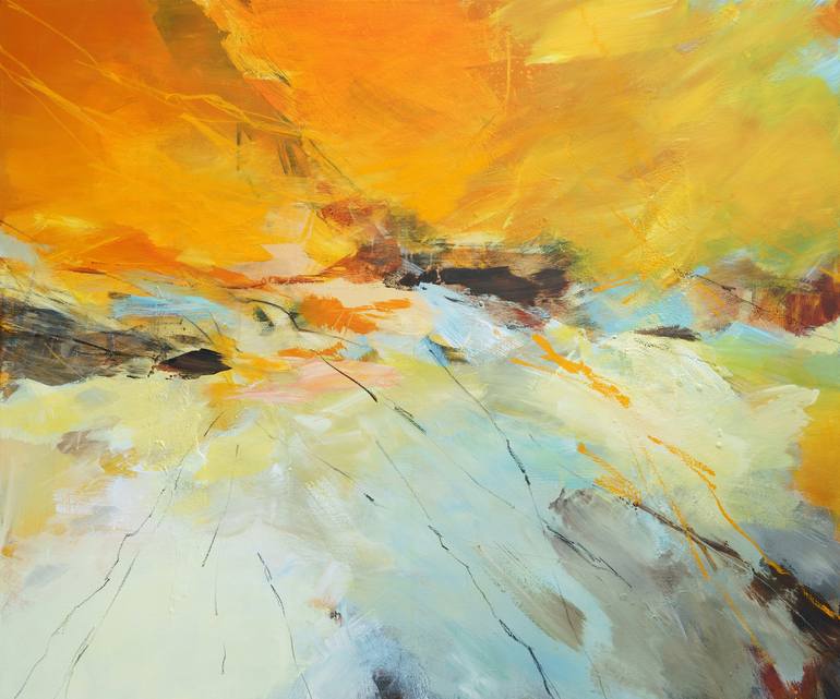 Materials: Stretched canvas, Acrylic and Oil Pastel Sides: Painted as a continuation of the motif Frame: Unframed, further framing possible but not necessary. Varnish: Silky finish with UV protection Signature: Front and verso, also signed Certificate of Authenticity The work will be shipped stretch...