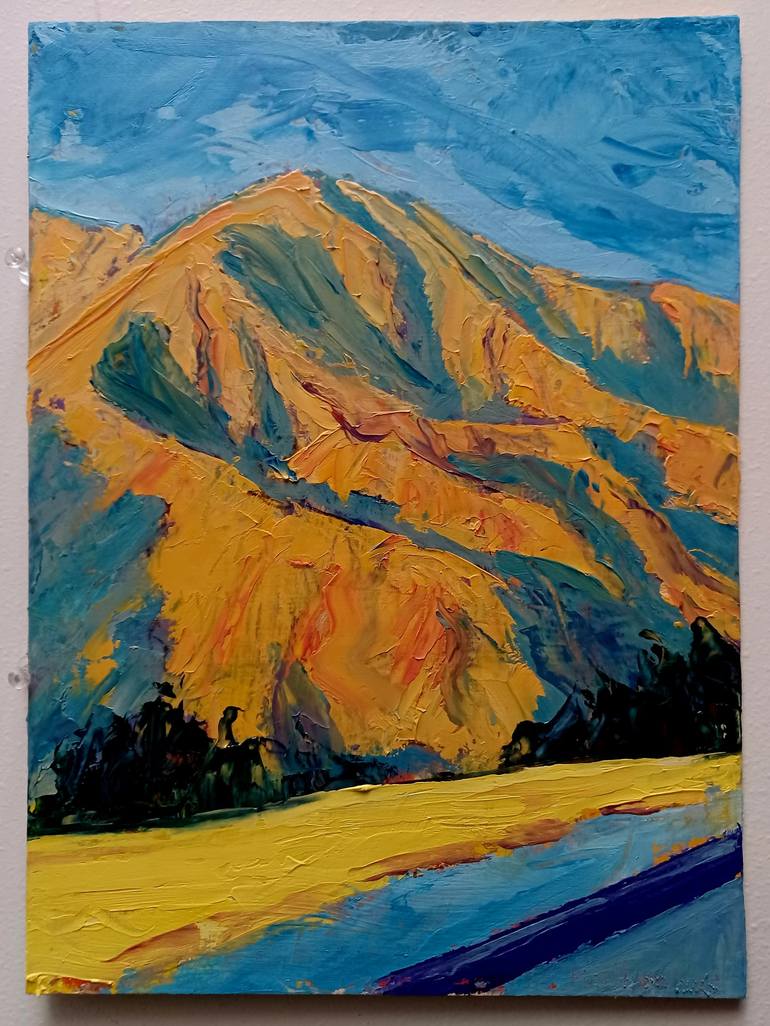"Yellow Roof and Beyond" captures a sun-drenched view of the San Gabriel Mountain foothills north of Pasadena. Painted en plein air, the scene is rendered with expressive brushstrokes and a vibrant palette, characteristic of both Impressionism and Expressionism. The titular yellow roof anchors the c...