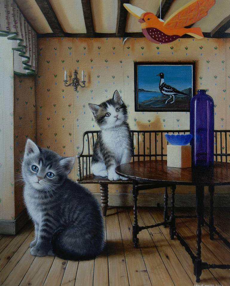 This painting is from a whimsical series of giant kittens in beautiful interiors. It is painted in a realistic manner, although I am playing with scale, since the kittens are impossibly large for the room. I wanted to create a sense of an accident waiting to happen, from the tall glass bottle on the...