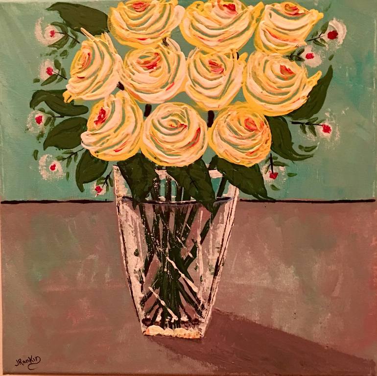 A simple Glass vase filled with Yellow Roses, I wanted to paint something simple but yet beautiful to look at, enjoy life, smell the roses!