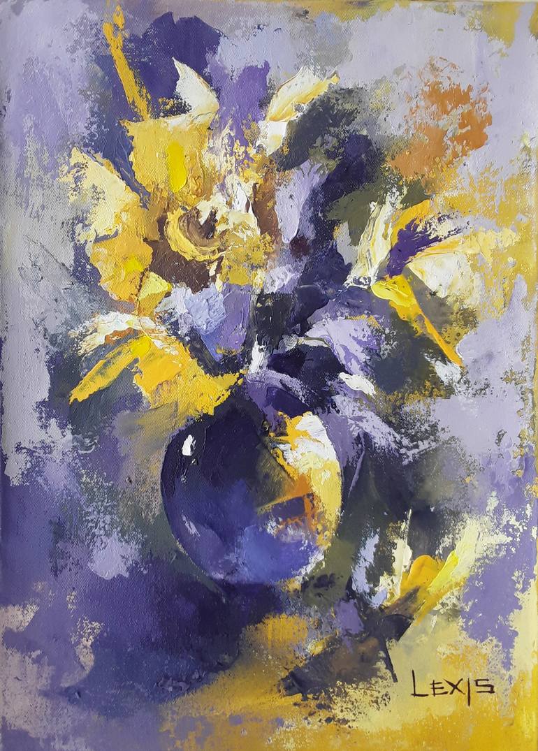 The artwork features a predominantly blue background with yellow and white accents evoking a sense of serenity and elegance, Nature is indeed beautiful, and so are flowers. This hand painted floral art captures the beautiful effects of the flower petals of yellows and violets as the sit in a violet ...