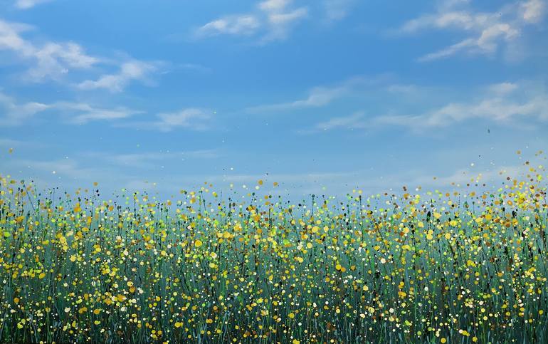 Title of work "Yellow flowers 3" The painting is written in the style of abstract expressionism.This work was created by acrylic on canvas. The work is signed on the reverse side. Size 95x150 cm