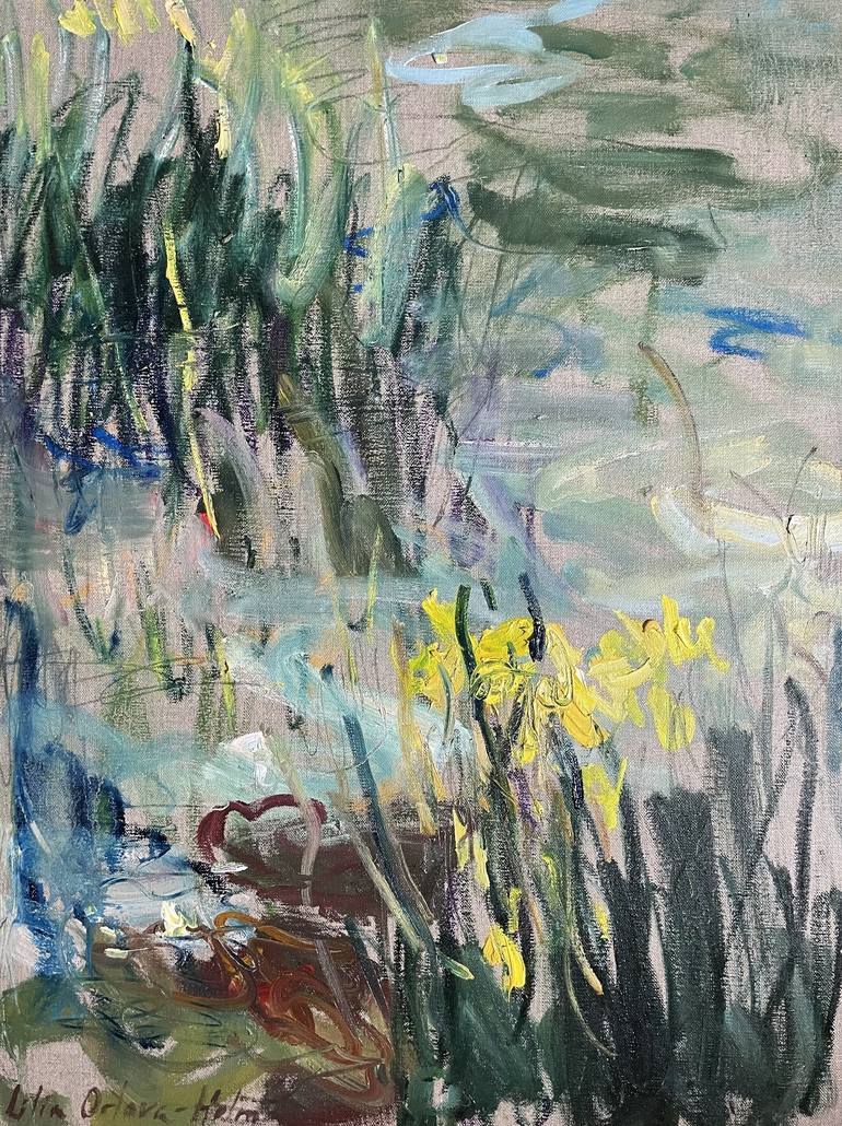 Expressive and gestural painting. Yellow irises by the pond. Oil on linen. 61x46cm.