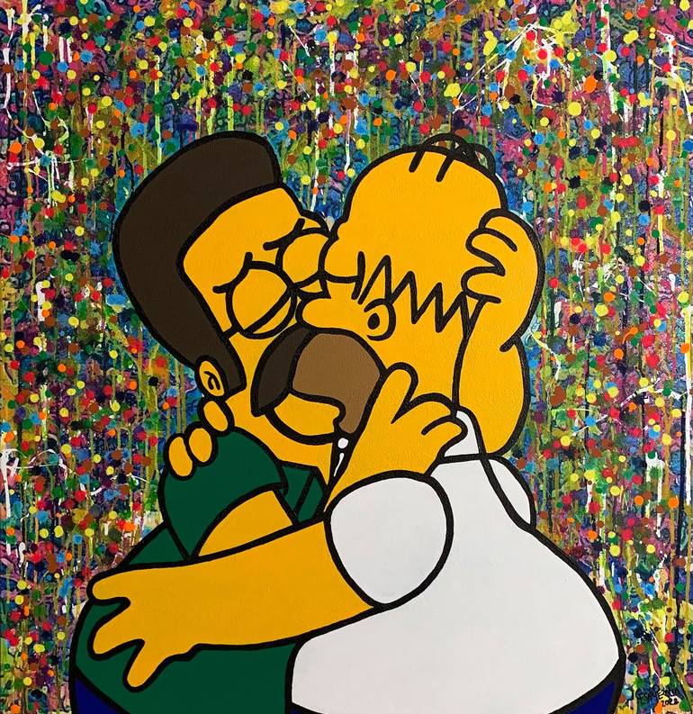 Yellow Love is this work in which I propose an alternative to the fighting that these two Simpsons characters have always had. This is a unique hybrid art piece: digital illustration + acrylic painting + augmented reality To see the augmented reality go to this link: ?igshid=YmMyMTA2M2Y= This sig...