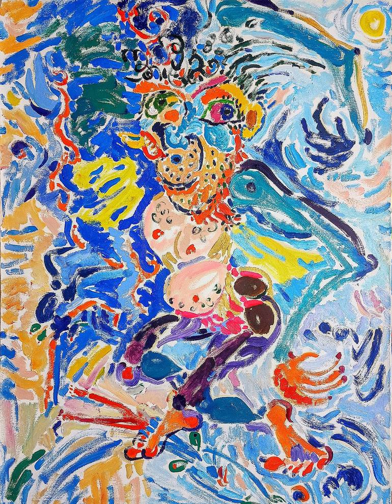 In this vibrant painting, Marana Klimanova invites the viewer into a whimsical world of playful swimmers. Utilizing a stylized blend of pixel abstraction and naïve art, the composition reflects a joyful interaction with nature. The use of bright colors and ethnic motifs adds depth, celebrating the s...