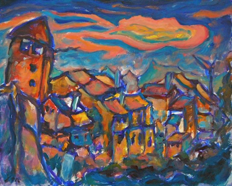 Folk expressionist painting of whimsical Spanish castle town landscape houses in surreal sunset hues. At once meditative and brimming with emotions and outworldly possibilities, the enigmatic Ainsa medieval kingdom beckons under its dramatic dusk skies. A work from the artist's “Spain Vignettes Se...