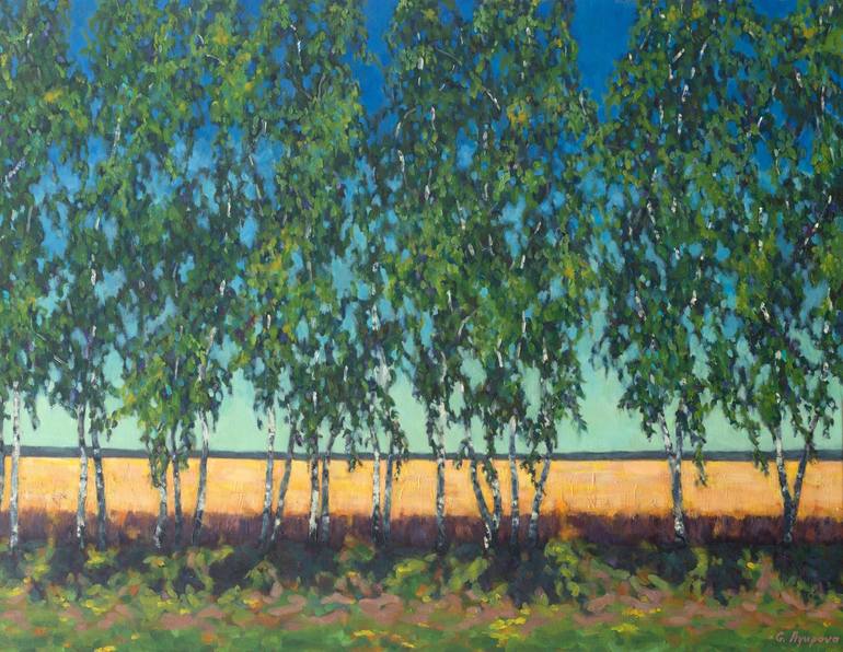 Young birch trees landscape oil painting on canvas. The summer landscape of beautiful nature with green trees and yellow field will add color and refinement to any interior. The painting is ready to hang with hanging hardware attached in the back of the painting.
