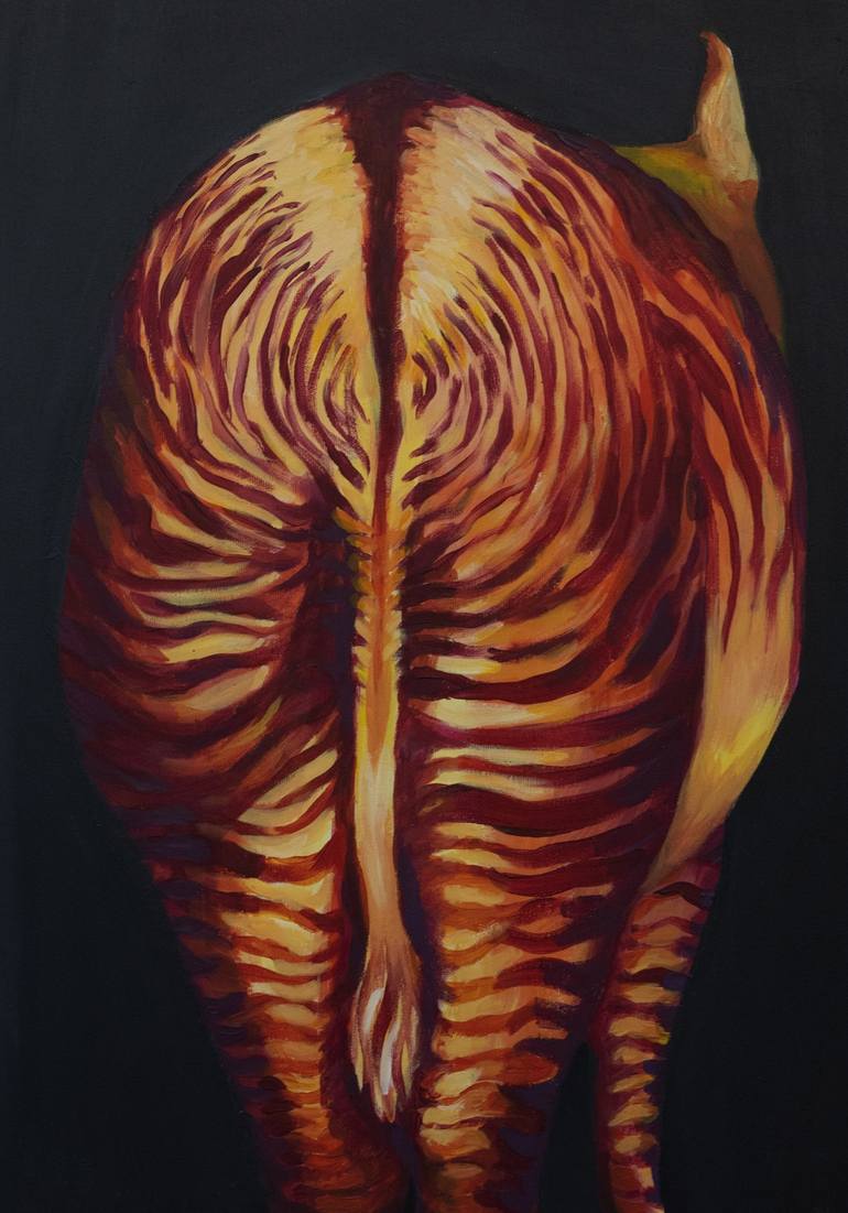 Zebra, other size This provocative painting invites us to explore the ordinary from a new perspective. When we think of a zebra, we typically envision the classic black-and-white striped animal, complete with its head, body, and legs. Rarely do we consider its back, or imagine a zebra in unexpecte...