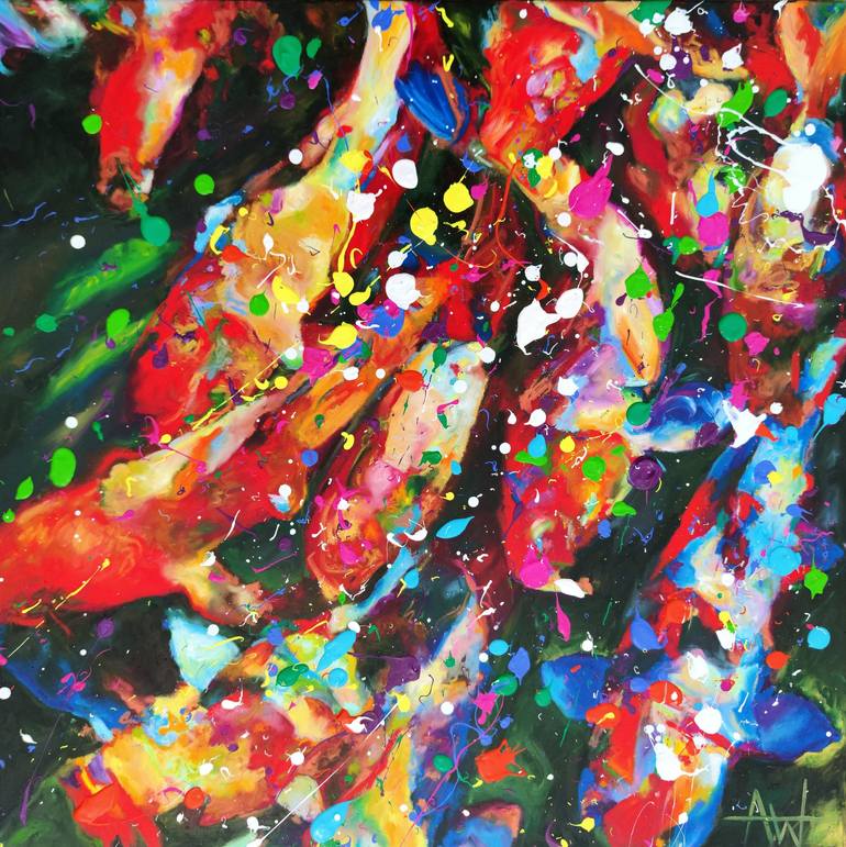 Zen Koi, oil on canvas, 90 x 90 x 2 cm “Zen Koi”, a flickering glimmer of red and gold, the water twists and turns. The green blue depths shine emerald as spectral life glides by. I glimpse the colour, I hang my hand in the water and feel the cool space where the graceful water phantoms live. I lose...
