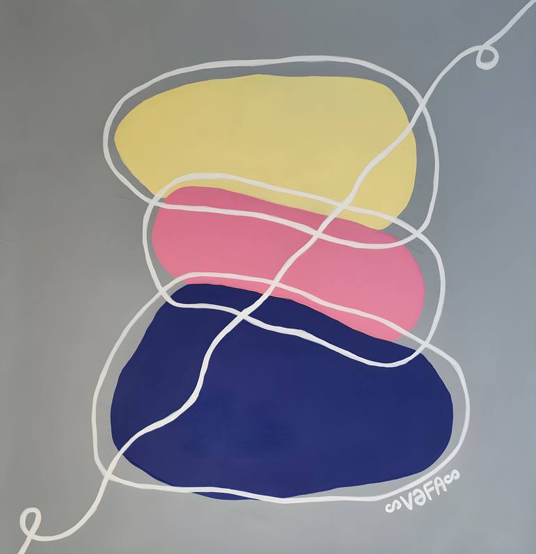 "Zen Minimalism. Nature's Equilibrium"is an original artwork that beautifully captures the harmonious interplay of spiritual symbolism and minimalist design. This evocative piece features deeply hued blue, pink, and butter yellow stones stacked vertically against a sophisticated deep gray background...