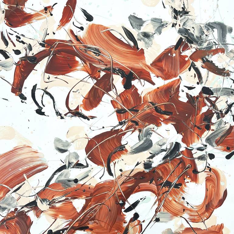 Individual strokes and traces of colors intertwine and combine until they create a final composition of the painting that is a capture of the author's perceptions and thoughts. The free strokes of wonderful ocre brown are mixed with light creamy colour and are completed with touches of black and dr...