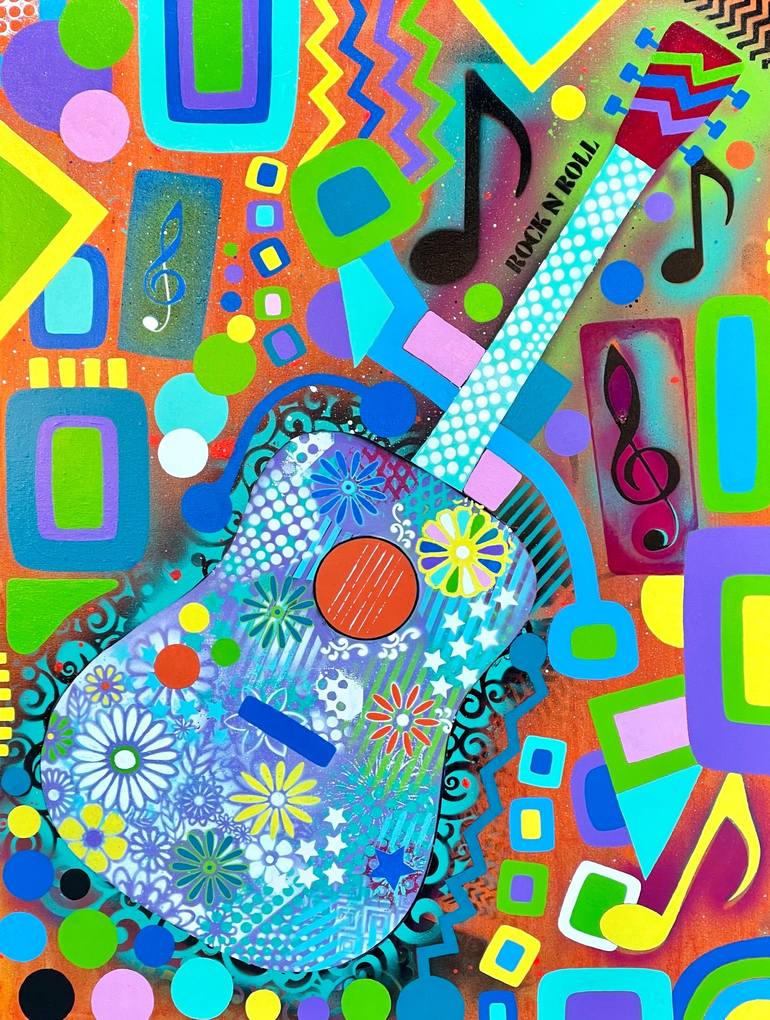 One of Rick VanHook's newest guitar paintings!! So popular! Finished with a high quality gloss varnish and is ready to hang. Sides are painted black.