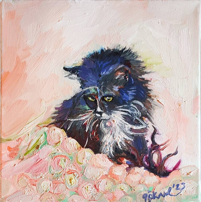 A Story of Love, Play & Belonging This heartwarming oil painting captures the playful and affectionate bond between the artist and her beloved cat, Zuzush. Once a stray, Zuzush found a new home and happiness in a city surrounded by nature. The artwork immortalizes a joyful moment—Zuzush, hidden ...