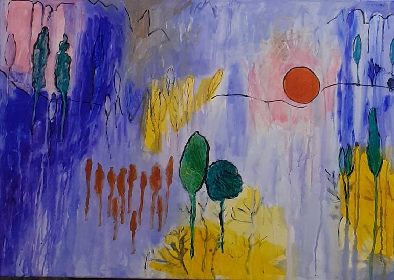When I start a paintingI am usually in a state of mind that is similar to a transe, my hand picks up colrs and brushes and just moves on my canvas.... why? I wish I knw and I had a formula for a good painting!The red sun could mean a dangerous epoch we are living in , the blue train is going nowhere...