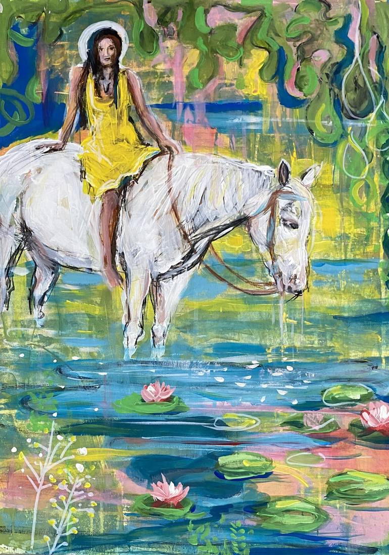 Indigena a orillas del rio amazonas, Caballo blanco bebiendo entre nenúfares, falda amarilla