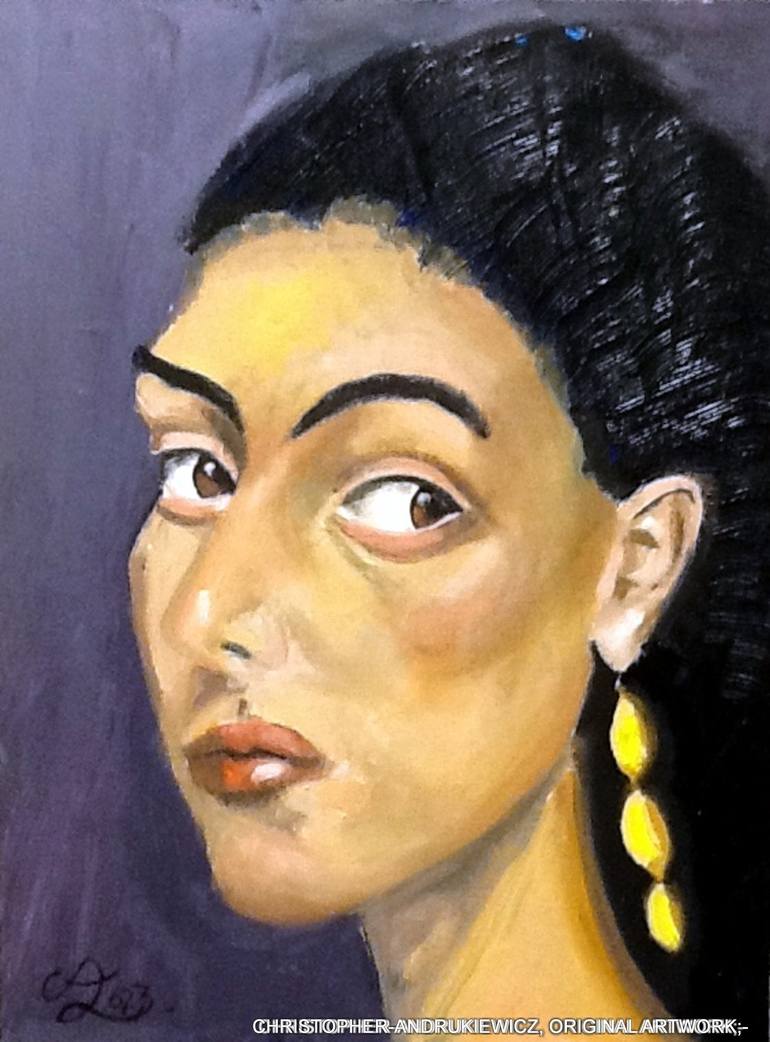 a strong featured female. a lady with black hair and wearing a long earing . she is striking a bold featured outlook. a continental complexion of skin tone. oil on canvas board.