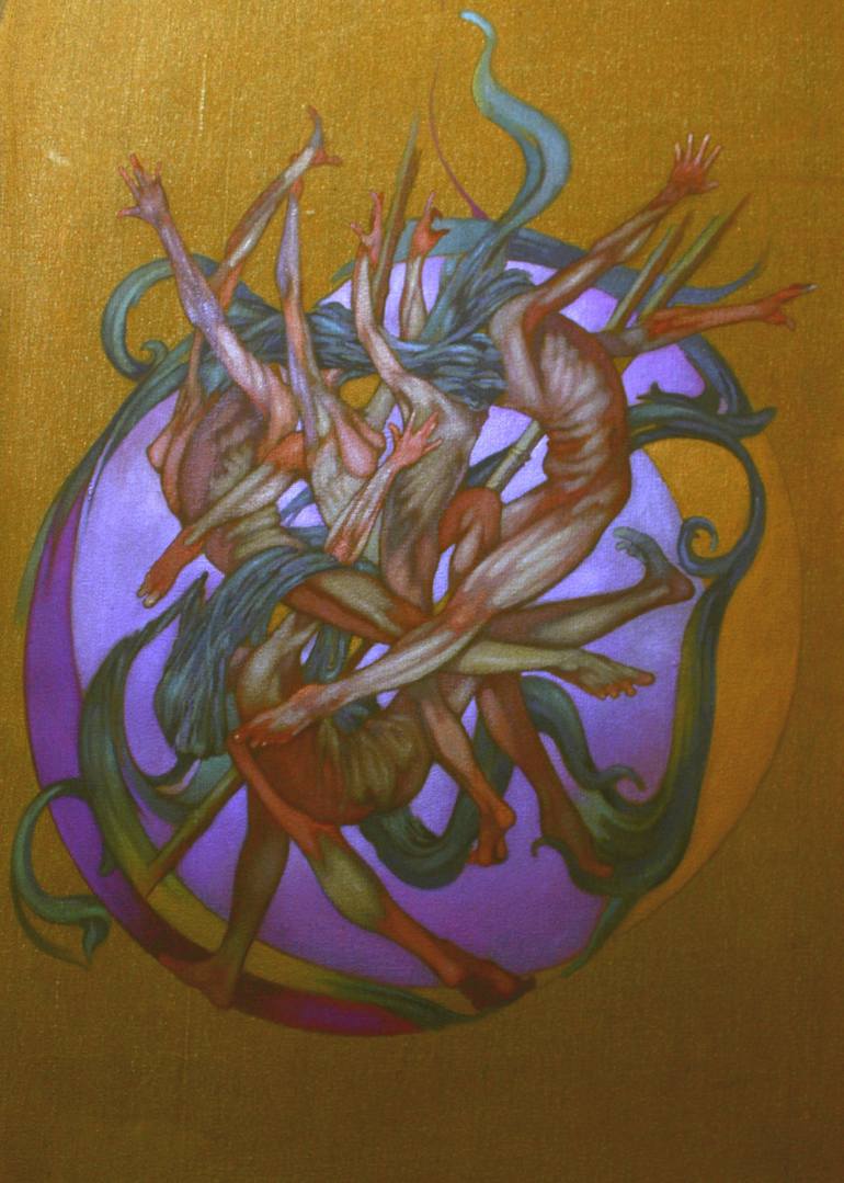 multiple figures dancing and climbing on each other reaching out for what they might be longing for